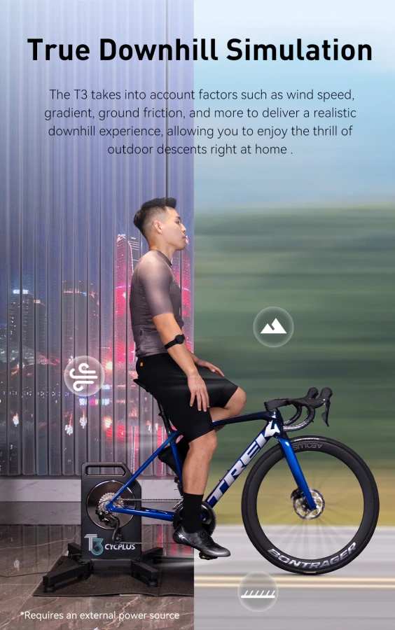 Simulácia klesania posúva trenažér CYCPLUS T3 na ešte vyššiu úroveň, berie do úvahy rýchlosť vetra, sklon, odpor terénu a Vami prednastavené dáta na to, aby Váš zážitok z jazdy bol čo najväčší.