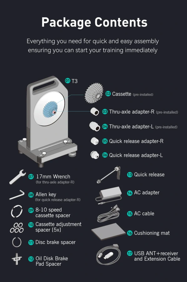 Trenažér CYCPLUS T3 je kompatibilný s väčšinou jazdných bicyklov, zahŕňajúce kolesá s kotúčovými brzdami, pevnými osami a rýchloupinákmi. Na trenažér je možné namontovať akákoľvek kazeta s počtom pastorkov 8-12, môžete si tak z Vášho trenažéra vytvoriť presnú kópiu Vášho bicykla, ktoré používate vonku.